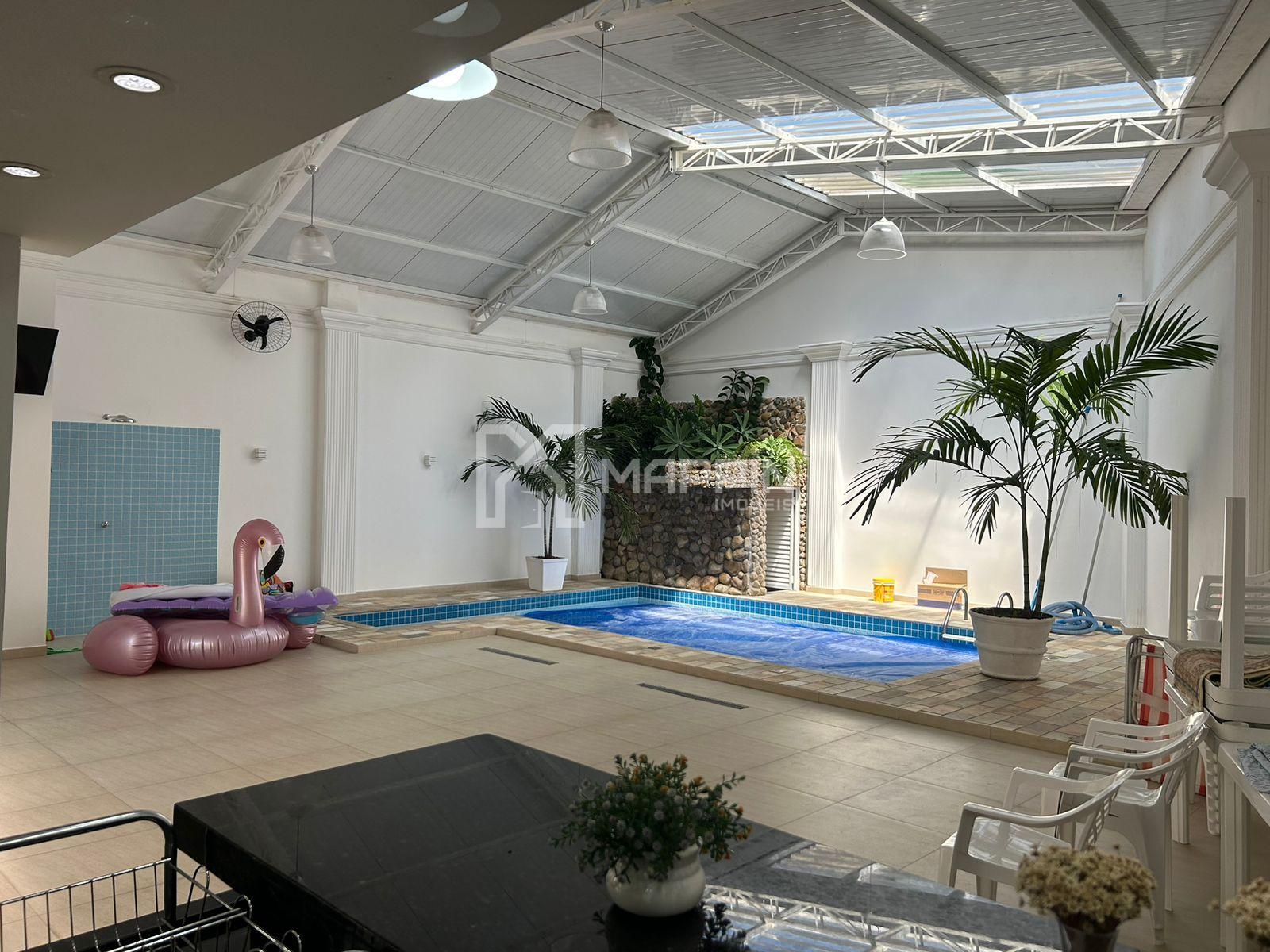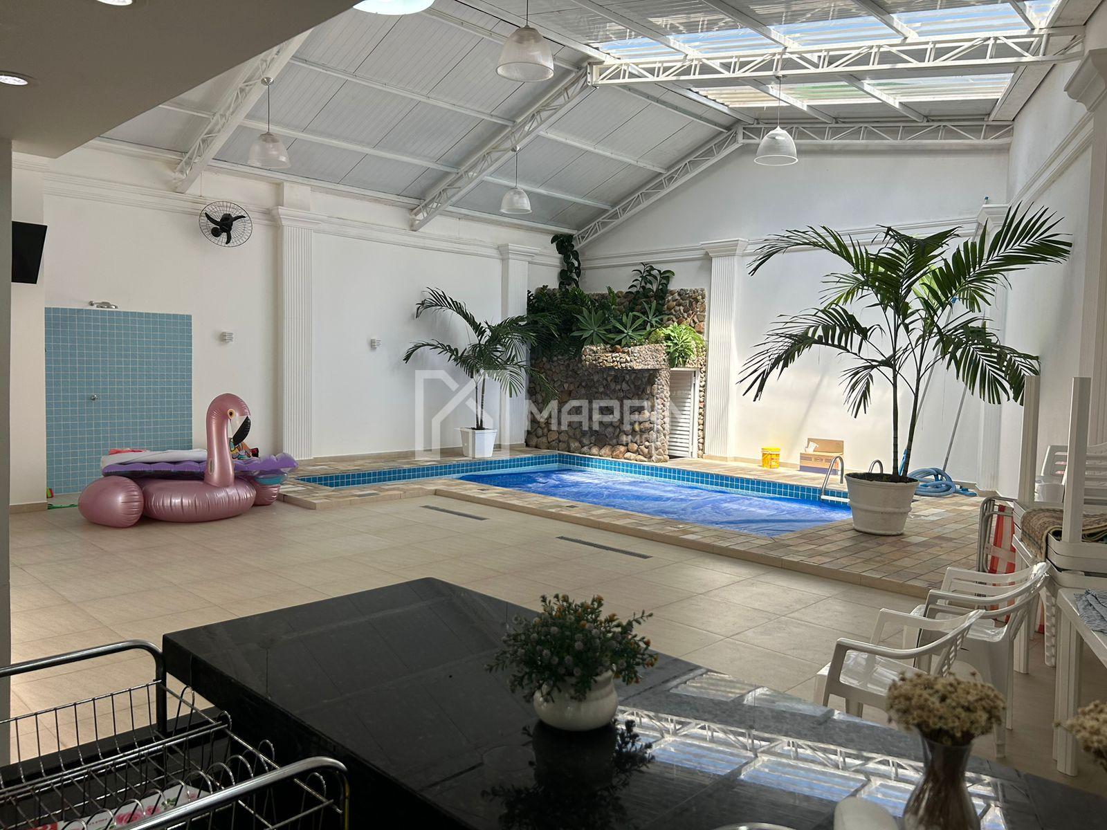 O ambiente externo é valorizado pela presença de uma ducha para momentos revigorantes, além de um lavabo que atende às necessidades dos convidados. A garagem coberta para 5 carros demonstra praticidade e segurança.